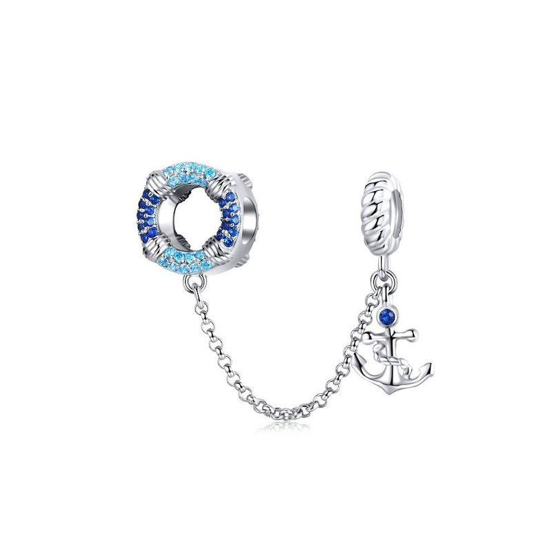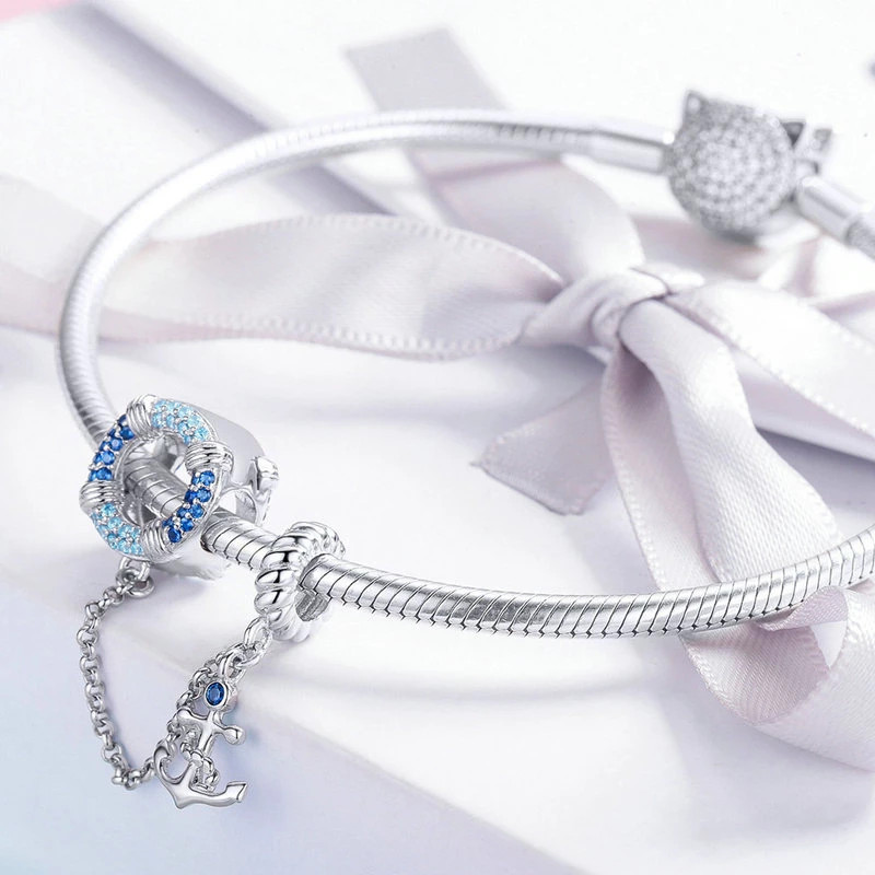 Ten wyjątkowy łańcuszek zabezpieczający wykonano z najwyższej jakości srebra próby 925, którego blask podkreślają błękitne i granatowe cyrkonie o diamentowym szlifie. Ich chłodny odcień przywołuje obraz głębokich oceanów i krystalicznie czystych fal. Jedna z końcówek charmsa przedstawia kotwicę ozdobioną kamieniem w kolorze głębi morza, druga – koło ratunkowe wysadzane migoczącymi kryształkami, które dodają całości luksusowego charakteru.