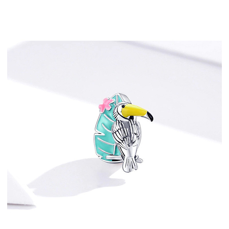 Centralnym punktem jest misternie wykonany tukan, którego dziób w intensywnym odcieniu żółci kontrastuje z lśniącym srebrem i pastelową zielenią liścia w tle. Ręcznie nakładana emalia jubilerska w odcieniach turkusu, różu i żółci tworzy idealną harmonię barw, przywołując klimat gorących plaż i szumu palm. Subtelne kontury skrzydeł oraz błyszczące wykończenie nadają całości głębi i trójwymiarowego efektu, dzięki czemu biżuteria wygląda jak małe dzieło sztuki.
