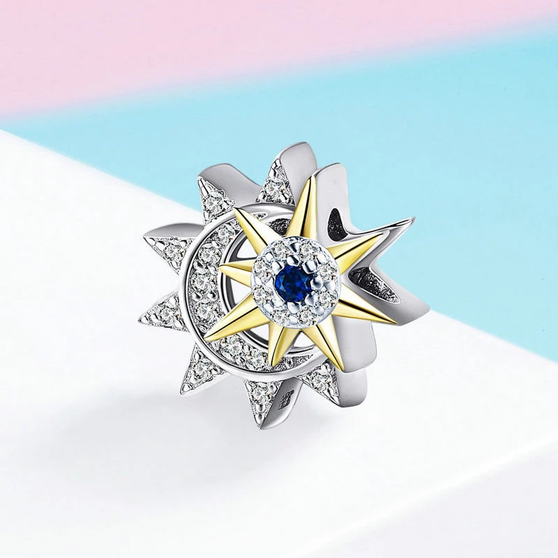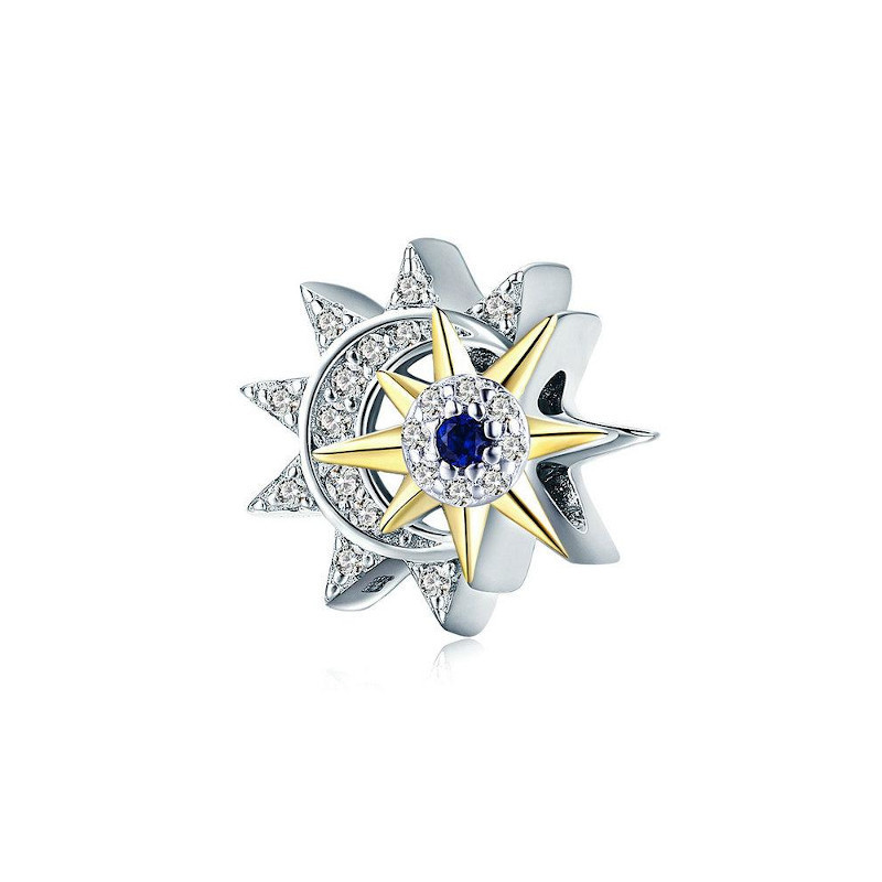Wykonany z wysokiej jakości srebra próby 925, zachwyca dbałością o detale. Centralną część zdobi złocona ośmiopromienna gwiazda, w której centrum lśni głęboki, szafirowy kamień, symbolizujący mądrość i spokój ducha. Otaczający ją krąg z lśniących cyrkonii tworzy subtelną poświatę, przypominającą migoczące gwiazdy na nocnym niebie. Tło ozdobione drobnymi, srebrnymi promieniami i geometrycznymi detalami przywodzi na myśl kompas – przewodnik po drodze do spełnienia marzeń.