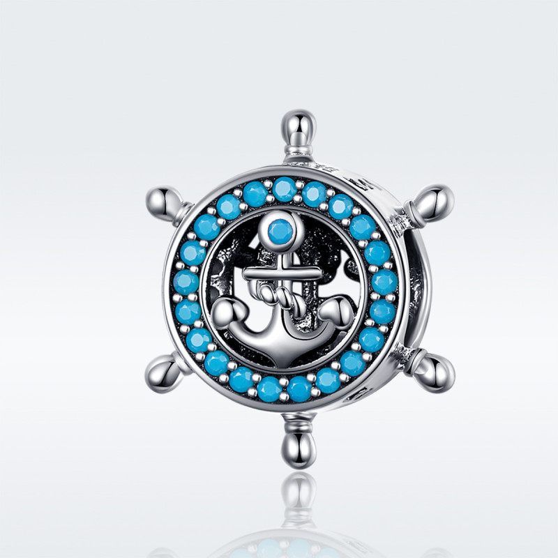 Wykonany z wysokiej próby srebra 925, zachwyca precyzją detalu i lustrzanym połyskiem. W centrum znajduje się trójwymiarowa kotwica opleciona liną, symbolizująca stabilność, siłę i wiarę w siebie. Otacza ją pierścień wysadzany błyszczącymi turkusowymi cyrkoniami, które mienią się niczym promienie słońca tańczące na powierzchni morza. Kształt koła sterowego z realistycznie odwzorowanymi uchwytami nadaje całości wyrafinowanego, marynistycznego charakteru.