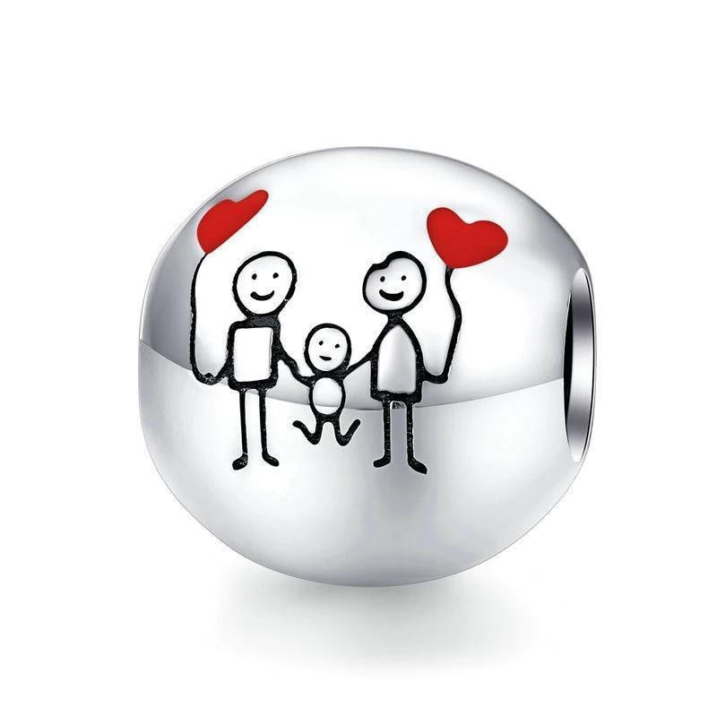 Na błyszczącej, srebrnej powierzchni znajduje się uroczy rysunek – rodzice trzymający dziecko za ręce, a nad nimi unoszą się czerwone serca. Ten prosty, a jednocześnie wzruszający motyw przypomina, że to właśnie rodzina stanowi fundament szczęścia i bezpieczeństwa. Charms emanuje ciepłem, pozytywną energią i dziecięcą radością, dodając każdej bransoletce wyjątkowego, osobistego charakteru.