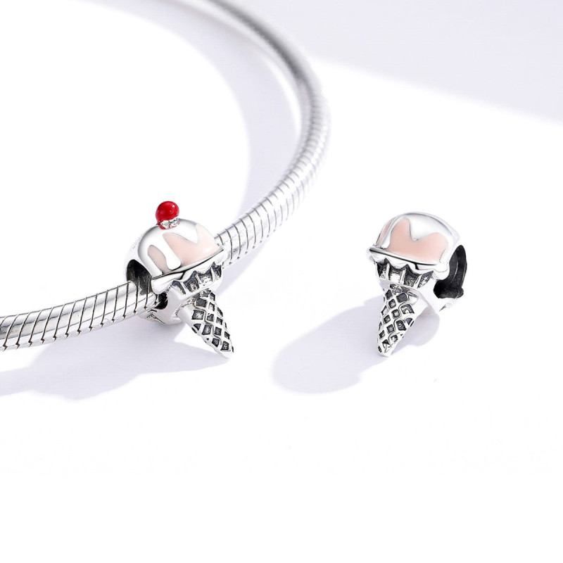 Motyw lodów z wisienką to symbol radości, młodzieńczej energii i przyjemności. Różowa emalia sprawia, że całość charmsa zyskuje subtelną lekkość, a czerwony akcent na szczycie symbolizuje życie pełne pasji i radości. Detale w postaci wysadzanych cyrkoniami elementów dekoracyjnych na waflowym rożku dodają elegancji i sprawiają, że charms lśni w świetle, tworząc efektowną ozdobę.
