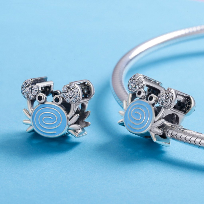 Centralnym punktem charmsa jest spiralny wzór w niebieskim odcieniu emalii, który przyciąga wzrok i symbolizuje spokój, harmonię i równowagę. Dwa złote cyrkonie w muszelkowych szczypcach kraba nadają mu elegancki, subtelny blask, a małe, czarne oczka kraba wprowadzają zabawny akcent do tego wyjątkowego wzoru.