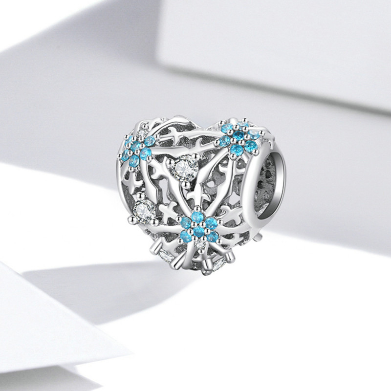 Charms urzeka finezyjnym kształtem – srebrne serce zdobią subtelne wzory przypominające kwitnące gałązki, wśród których rozkwitają drobne kwiaty wysadzane niebieskimi i przezroczystymi cyrkoniami. Każdy detal został wykonany z niezwykłą precyzją, a gra światła między błękitem a połyskiem srebra tworzy efekt elegancji i lekkości. To biżuteria, która symbolizuje czystość uczuć i wewnętrzny spokój.