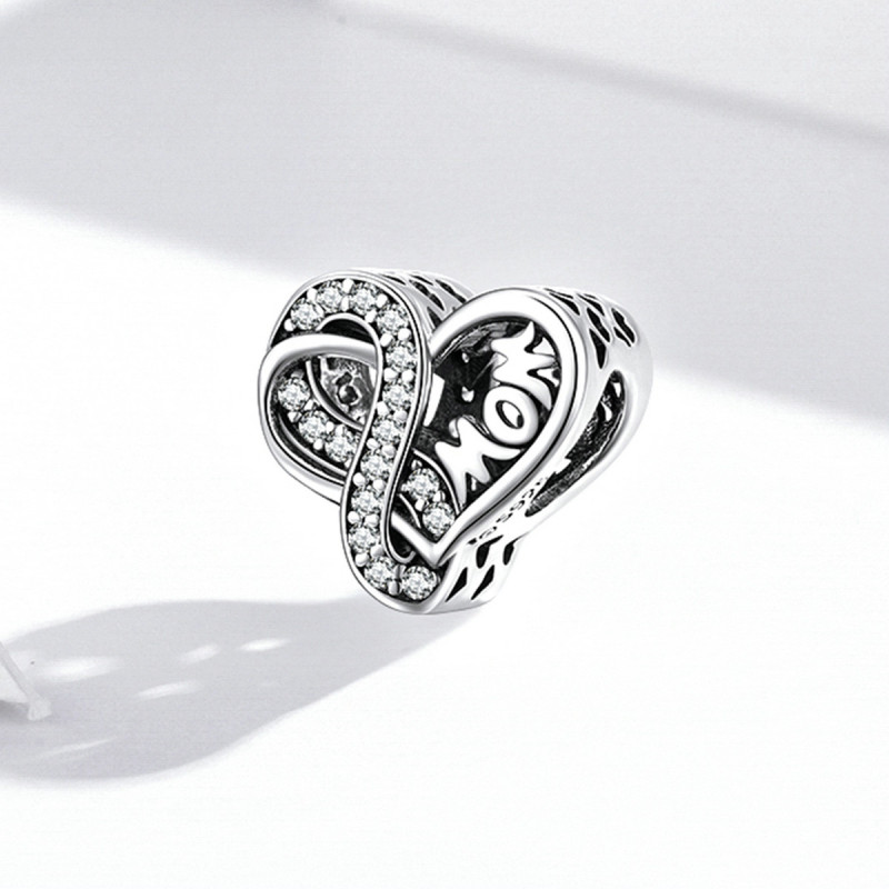 W centrum kompozycji znajduje się subtelny napis MOM, otulony migoczącymi, bezbarwnymi cyrkoniami osadzonymi z jubilerską precyzją. Ich diamentowy blask rozświetla srebro, nadając całości luksusowego charakteru. Lekko ażurowe boki charmsa sprawiają, że zawieszka jest lekka i pełna powietrza, a jej elegancki połysk przyciąga spojrzenia z każdej strony.