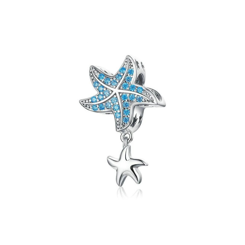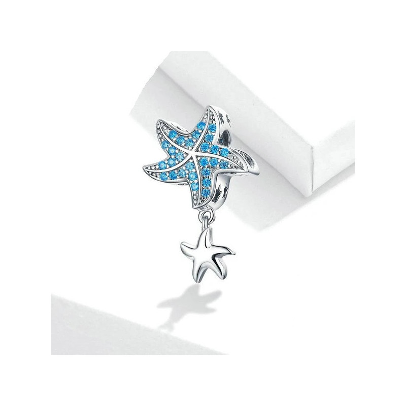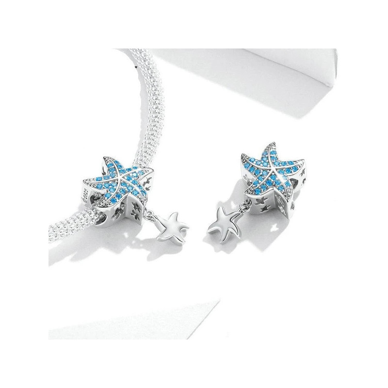 Każdy detal tej biżuterii został dopracowany z niezwykłą precyzją. Górna część charmsa przedstawia lśniącą rozgwiazdę wysadzaną maleńkimi, misternie oprawionymi cyrkoniami w odcieniach oceanu – od błękitu laguny po głęboki turkus. Zawieszony poniżej srebrny element w kształcie drugiej, delikatnej rozgwiazdy dodaje kompozycji lekkości i ruchu, jakby biżuteria poruszała się w rytmie fal.