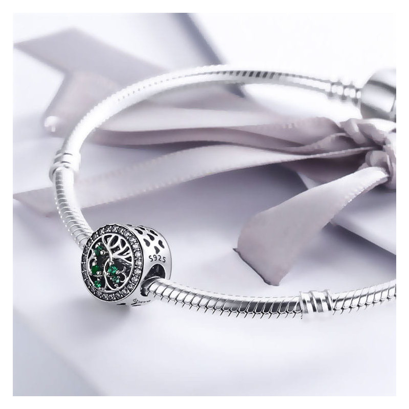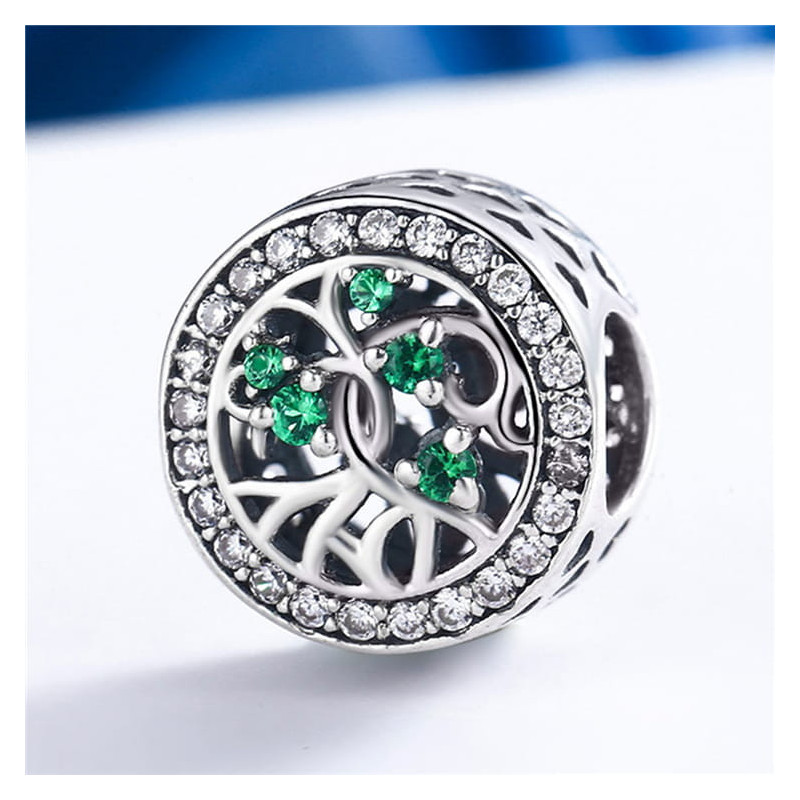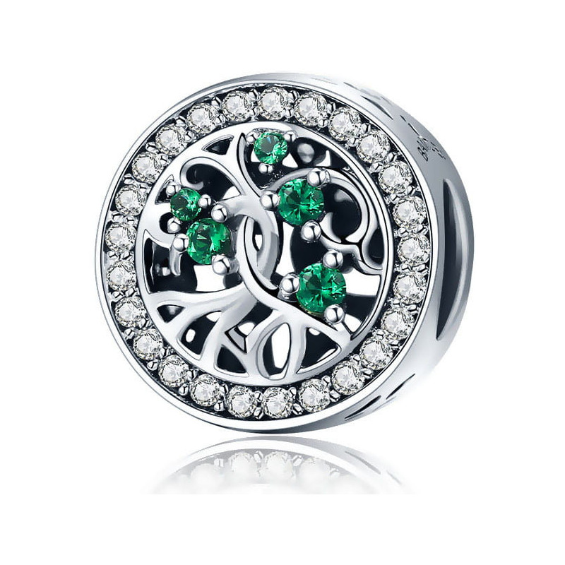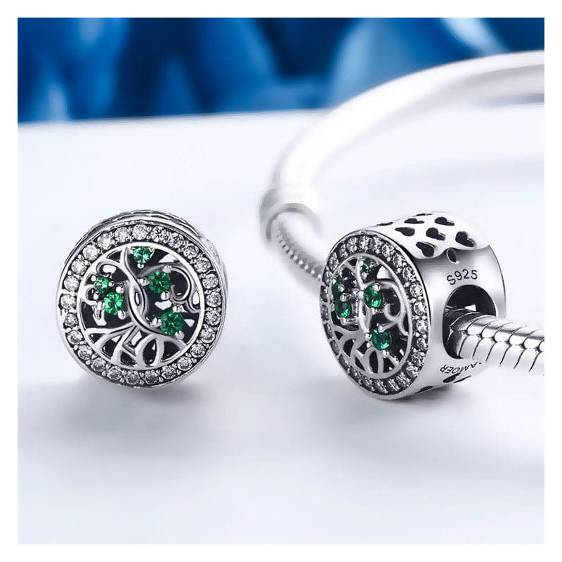 Wykonany z najwyższej jakości srebra próby 925, charms zachwyca precyzyjnym wzorem drzewa o subtelnie wijących się gałęziach i korzeniach, które przenikają się w doskonałej symetrii. Centralną część zdobią lśniące zielone cyrkonie, symbolizujące naturę, życie i odrodzenie. Ich głęboki kolor pięknie kontrastuje z chłodnym połyskiem srebra, tworząc efekt luksusu i harmonii. Ramę zawieszki wieńczy misternie osadzony pierścień z białych cyrkonii, które otulają wzór niczym promienie światła, dodając całości blasku i elegancji.