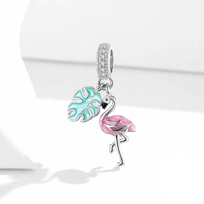 Motyw flaminga w różowym kolorze, z detalami w postaci drobnych cyrkonii w jego ciele, tworzy subtelny, ale pełen charakteru wygląd. Liść na tle, również w pastelowych kolorach, podkreśla tropikalny charakter charmsa, przypominając o egzotycznych miejscach pełnych ciepła i radości. Różowa emalia nadaje cały projekt lekkości, a zielona emalia na liściu dopełnia harmonii.