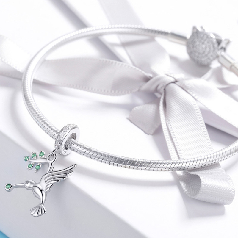 Charms przedstawia kolibra w pełnym locie, z rozłożonymi skrzydłami i małym zielonym liściem w jego dziobie, który symbolizuje odrodzenie, harmonię i nadzieję. Zielone cyrkonie, umieszczone na skrzydłach ptaka, doskonale współgrają z srebrnym odcieniem charmsa, tworząc efektowny kontrast. Cyrkonia na głowie kolibra dodaje mu błysku, a cała konstrukcja emanuje lekkością i elegancją.
