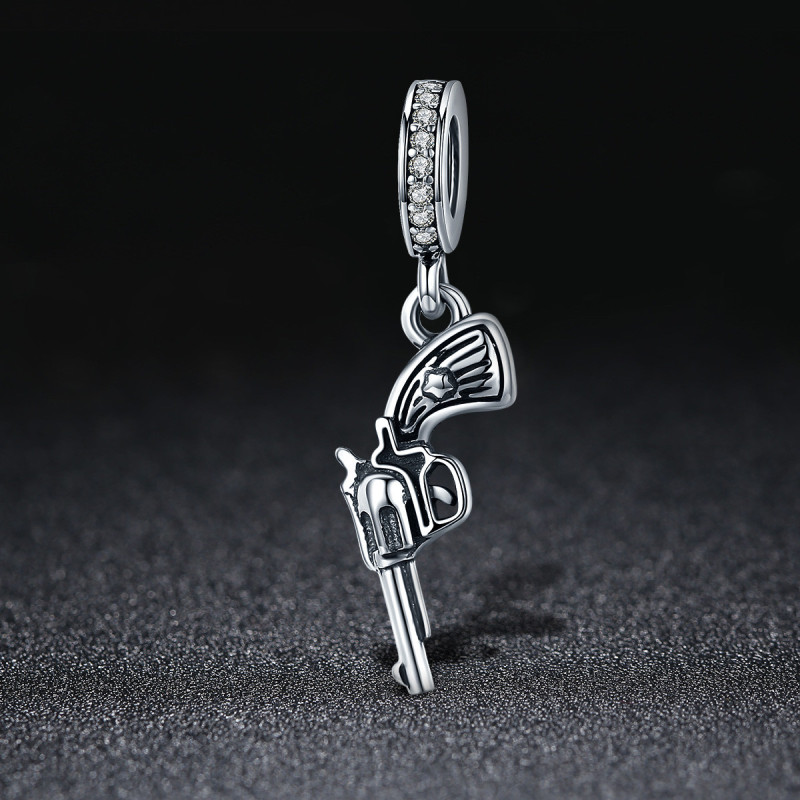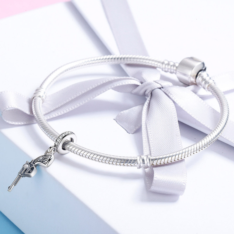 Charms przedstawia klasyczny rewolwer o precyzyjnie odwzorowanych detalach: od grawerowanego uchwytu, przez lufę, aż po delikatnie oksydowane krawędzie, które dodają głębi i autentyczności. Uchwyt bransoletki ozdobiono rzędem błyszczących cyrkonii, które pięknie kontrastują z surowym motywem broni, nadając całości luksusowego charakteru.