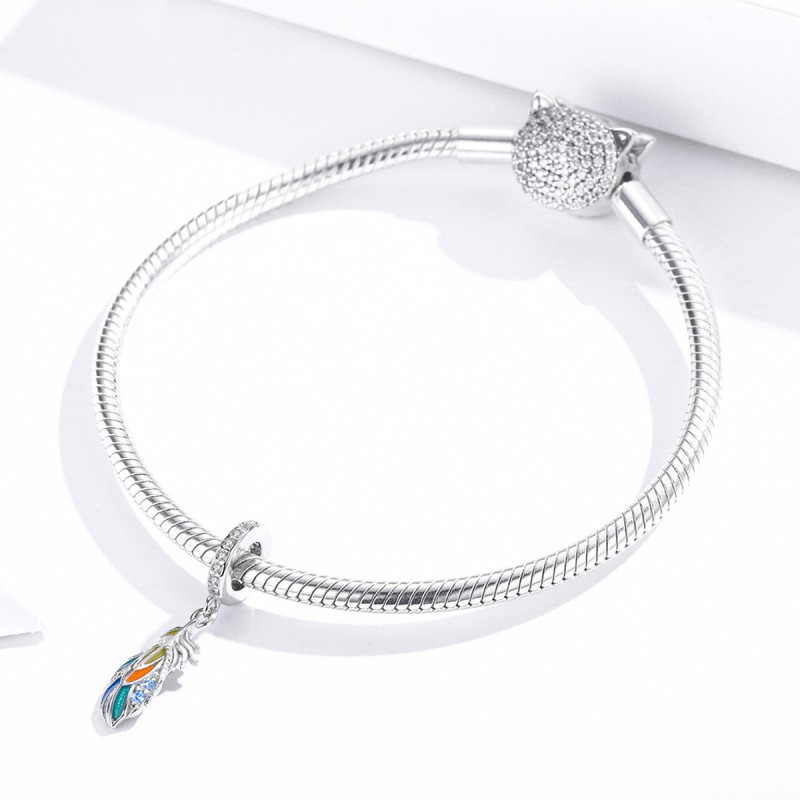 Każdy szczegół został dopracowany z najwyższą precyzją – od srebrnych krawędzi pióra po błyszczące cyrkonie, które subtelnie migoczą przy każdym ruchu. To charms, który przyciąga wzrok i zachwyca lekkością formy. Doskonale pasuje do bransoletek modułowych Pavos, Pandora i innych kompatybilnych systemów, wnosząc do kolekcji odrobinę koloru i artystycznego wyrazu.