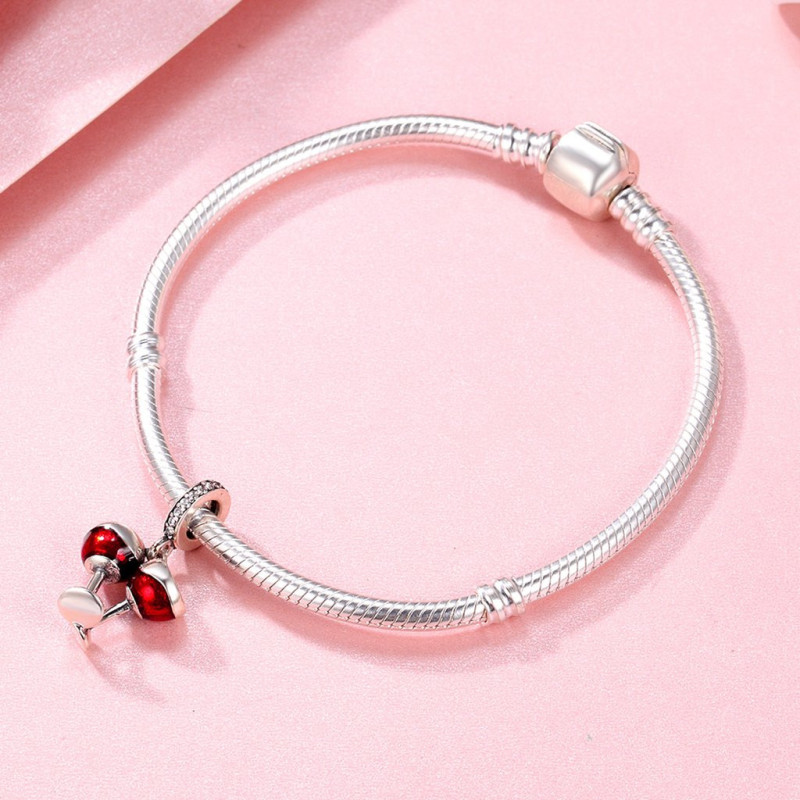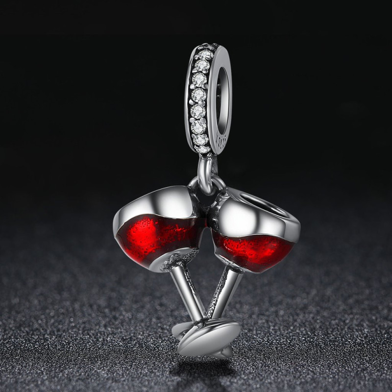 Kieliszki wypełnione są głęboką, czerwono-bordową emalią o szklistym połysku, która przypomina rubinowe wino podawane podczas wieczoru pełnego śmiechu, rozmów i wspomnień. Zawieszka ozdobiona jest dodatkowo rzędem lśniących cyrkonii, które odbijają światło jak refleksy na tafli szkła, dodając całości subtelnego, luksusowego blasku.