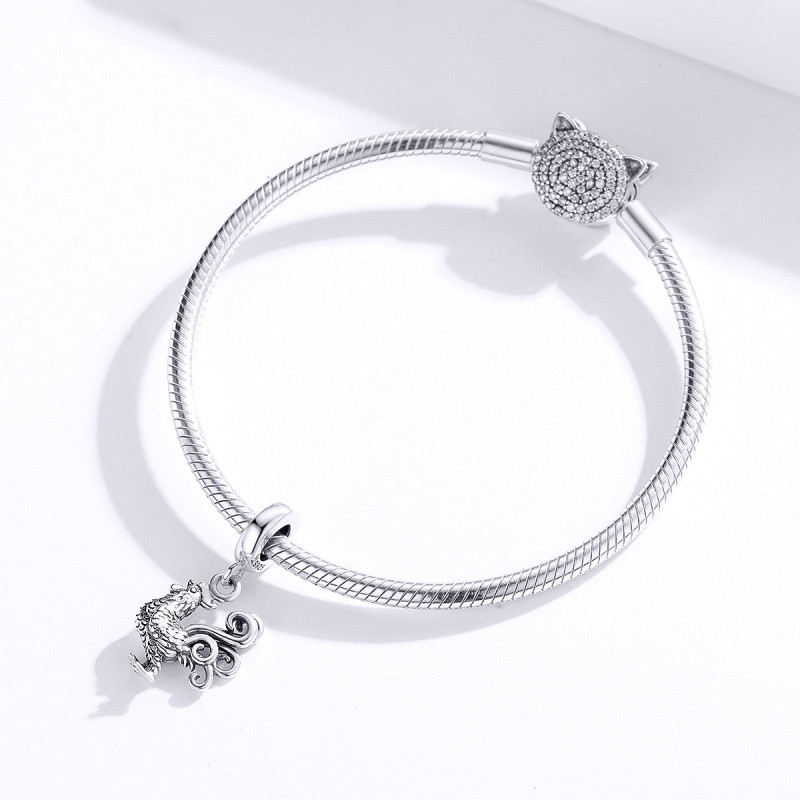 Wykonany z najwyższej jakości srebra próby 925, charms przedstawia majestatycznego koguta o misternie rzeźbionym upierzeniu i finezyjnie zakręconym ogonie. Jego postawa pełna jest dynamiki i elegancji, a starannie wypolerowana powierzchnia pięknie odbija światło, nadając zawieszce luksusowy charakter.
